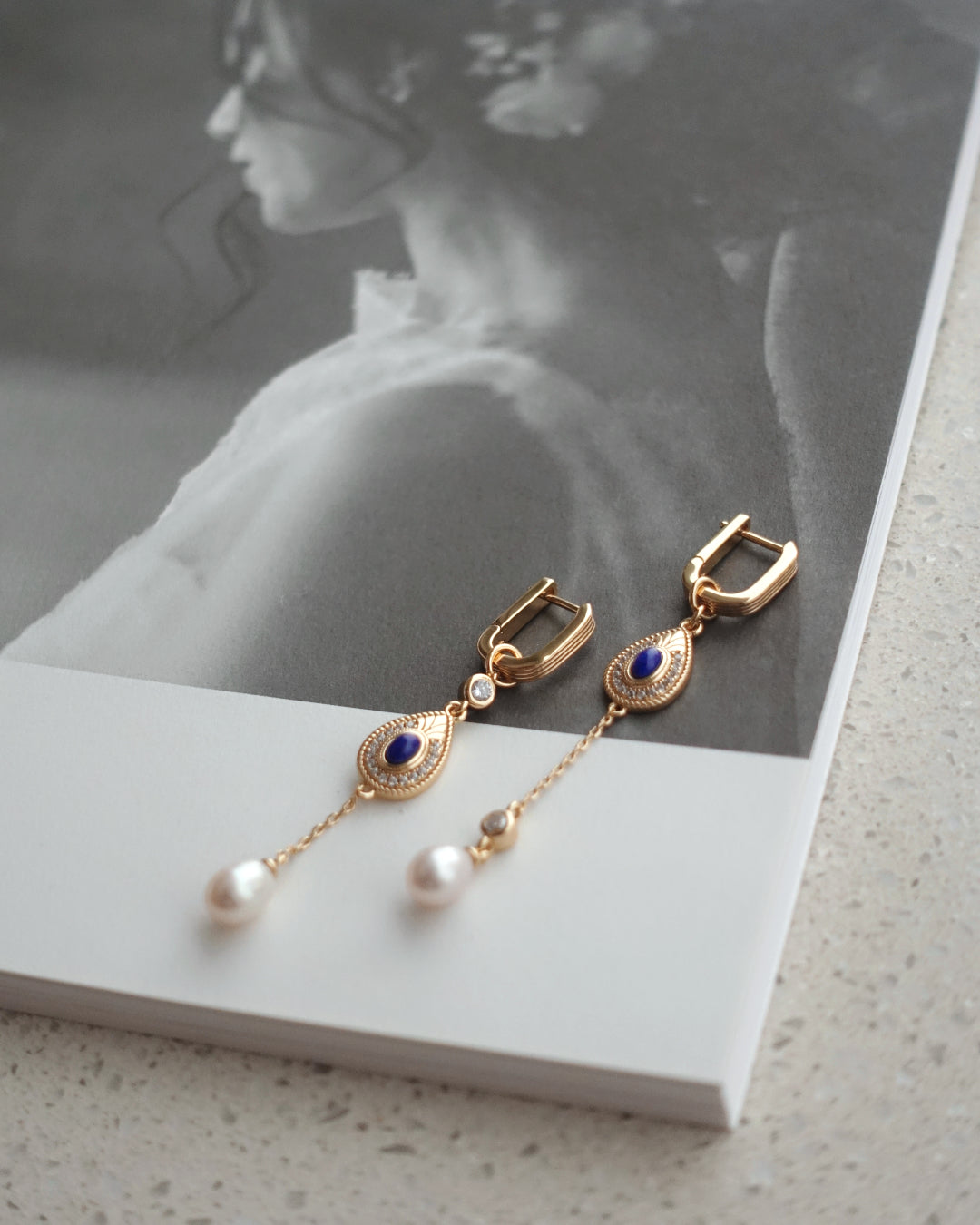 深い藍のラピスラズリと清らかな真珠が、夜空と月の神秘、波の優美さを映し出す。海と空の無限の広がりを象徴し、月と波の物語を紡ぐ。