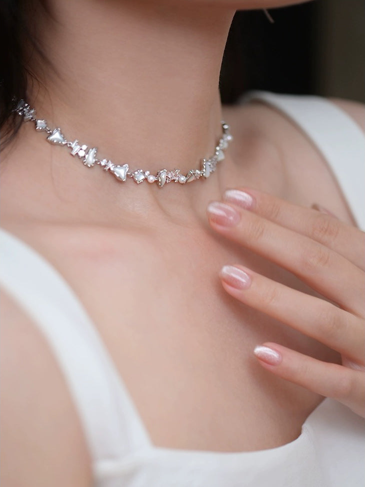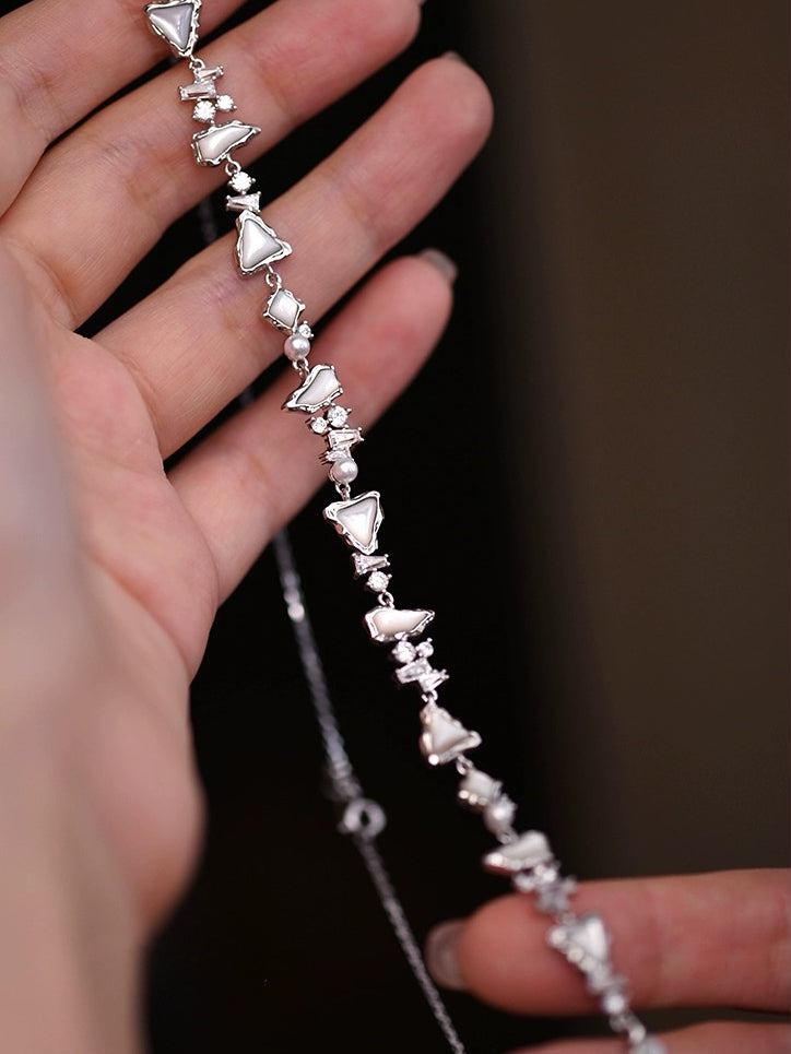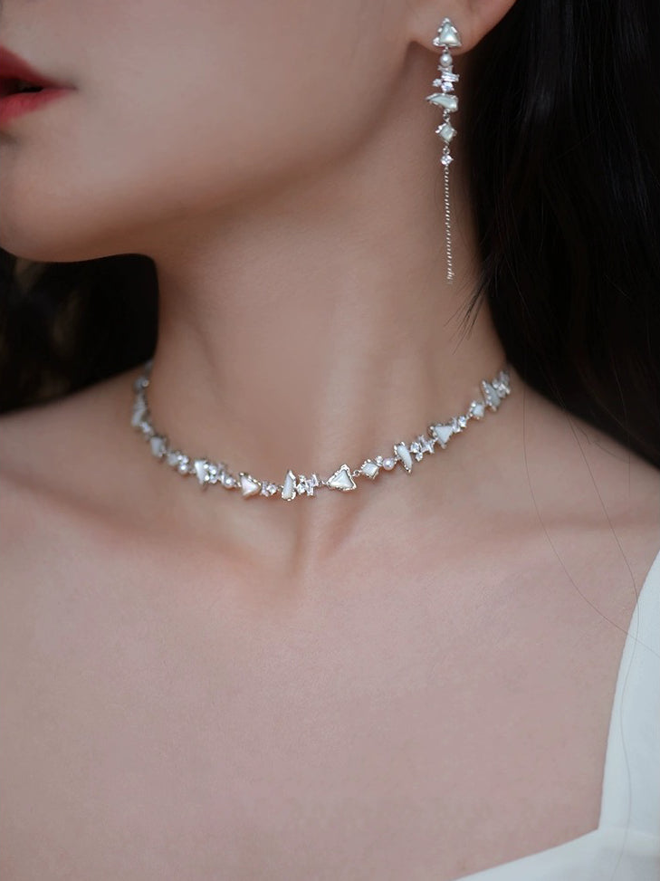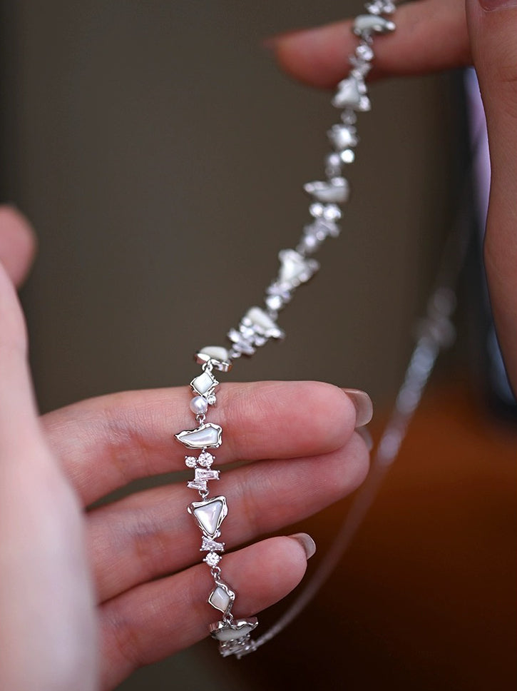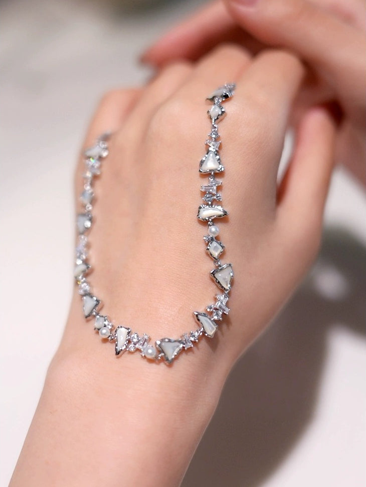 ピアス、ブレスレット、ネックレスに、シルバーの冷ややかな輝きと異なる形状の母貝が織り成すデザインは、まるで凍てつく氷河のように美しく神秘的。キュービックジルコニアが雪の結晶のように煌めき、まばゆい光を放ちます。母貝の個性的なフォルムとシルバーのモダンな風合いが調和し、どんなスタイルにも洗練されたアクセントを添えます。自然のエッセンスと美しさを感じさせるアクセサリーで、あなたのスタイルに静かながらも魅力的な輝きを纏いましょう。